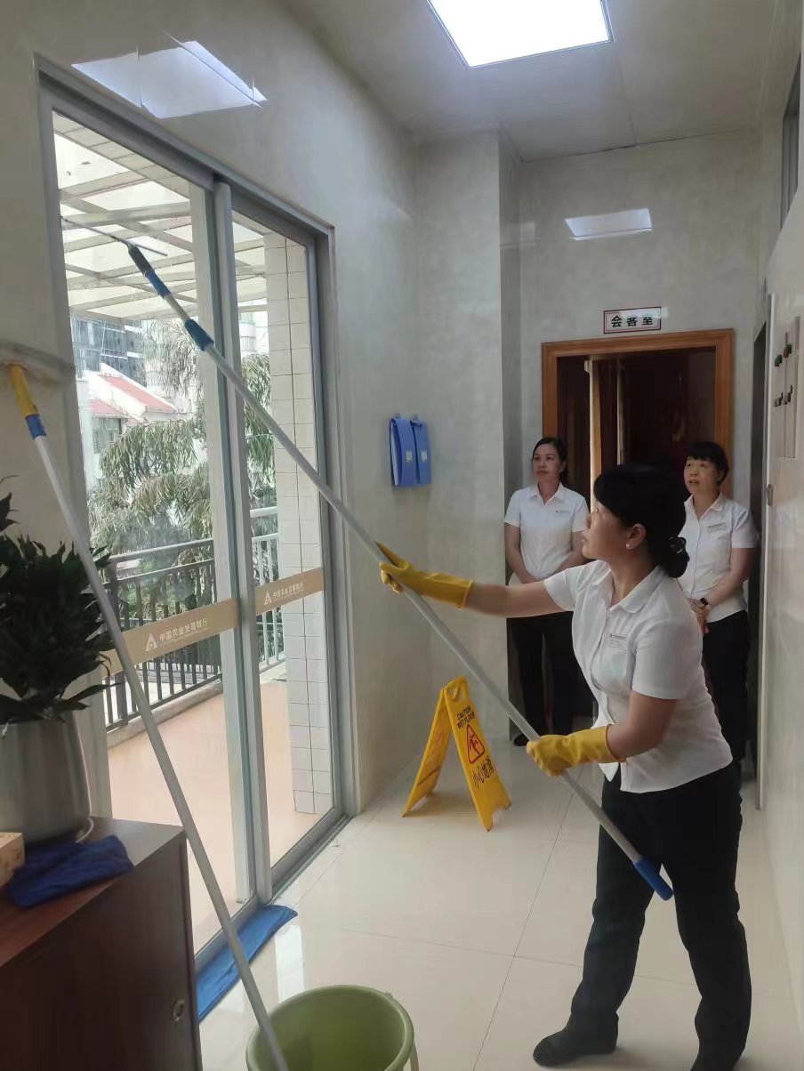保洁类队伍针对竞赛选拔细则对每组人员按点纠偏,进行玻璃窗清洁+推尘等操练,总结改进,优化提升,增强了参赛队员的自信心。